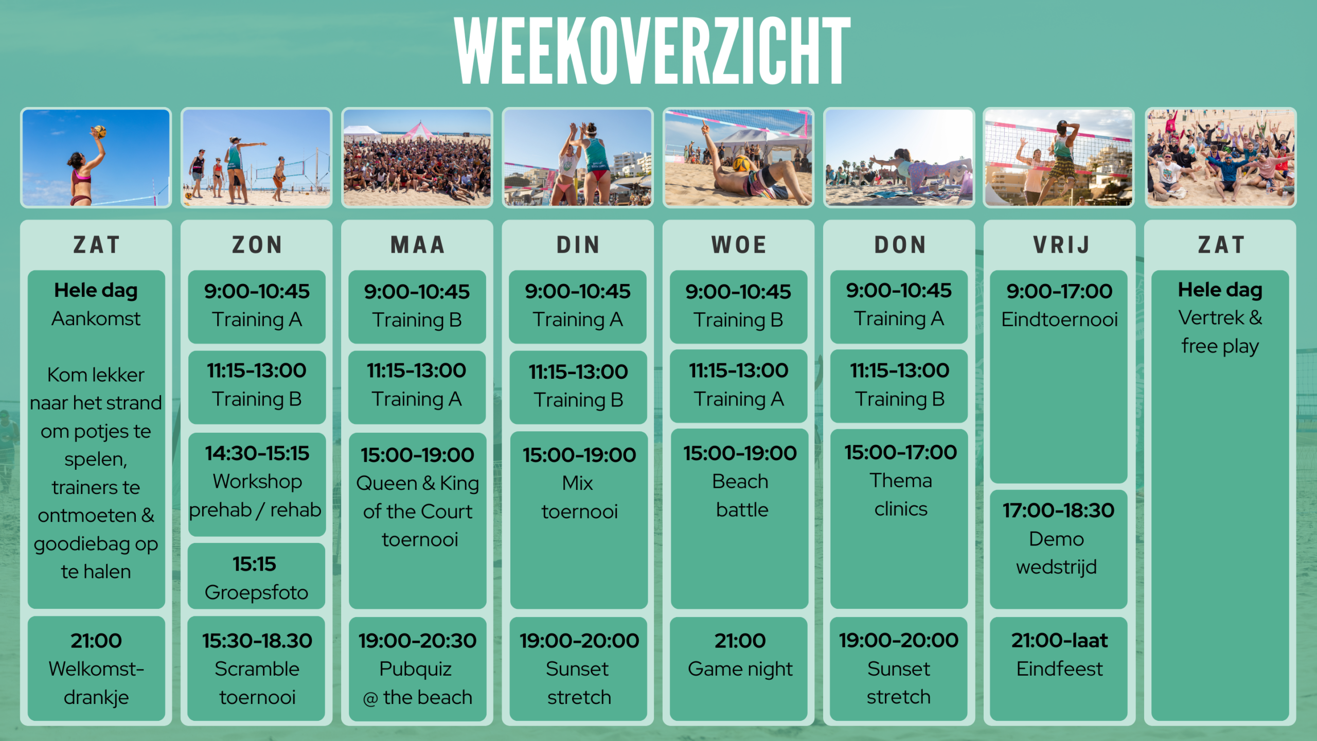 Dat je op een prachtig strand loopt na afloop van een lekker intensieve training waarin je allerlei nieuwe tips gekregen hebt over je spel. En waar je neerploft tussen de zonnebrandflesjes en beachvolleyballen, samen met een groep andere beachers. Nadat je net om af te koelen een plons hebt genomen in de azuurblauwe zee en je een slok neemt van dat welverdiende koude drankje…